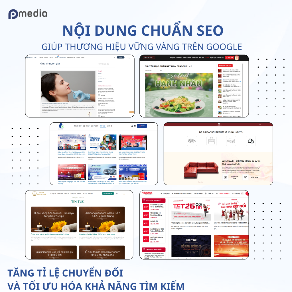 Tại Pmedia, dịch vụ SEO tổng thể được triển khai theo định hướng dài hạn, kết hợp tối ưu kỹ thuật website, xây dựng nội dung chuẩn SEO và cải thiện mức độ thân thiện với công cụ tìm kiếm, từ đó hỗ trợ doanh nghiệp tiếp cận khách hàng tiềm năng hiệu quả hơn